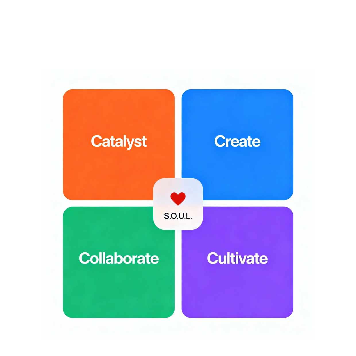 At our core is a code. A clear blueprint and framework, C4(SOUL). This offers a powerful tool for individuals, teams, and organizations to navigate creative collaboration, solve complex problems, and foster continuous growth. It bridges fields and disciplines, allowing for cross-pollination of ideas. By simplifying complexity, it gives structure to innovation while embracing the fluid, fractal nature of growth. It’s a blueprint for pioneering the future of collaborative creation.